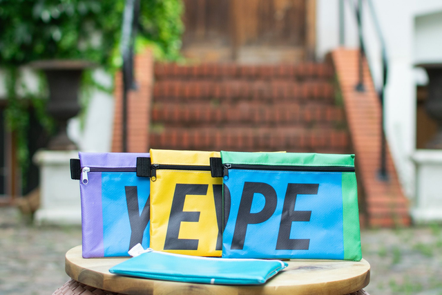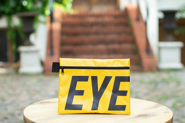 Unique A5 case made out of upcycled event banners. Sturdy canvas material. Dimensions approx. 18.5cm x 14.5cm x 0.5cm with a zipper on the side.