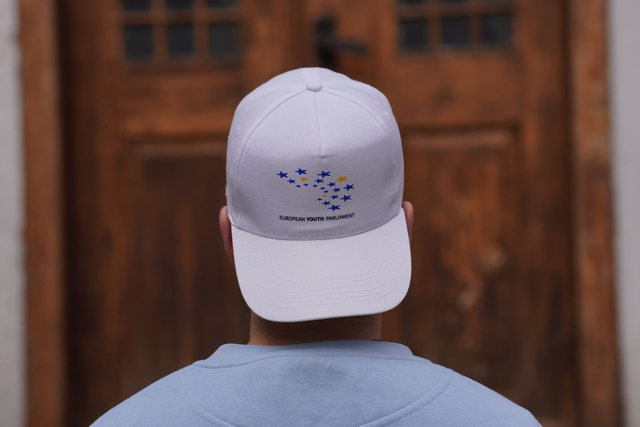 White cap with EYP logo in the middle.