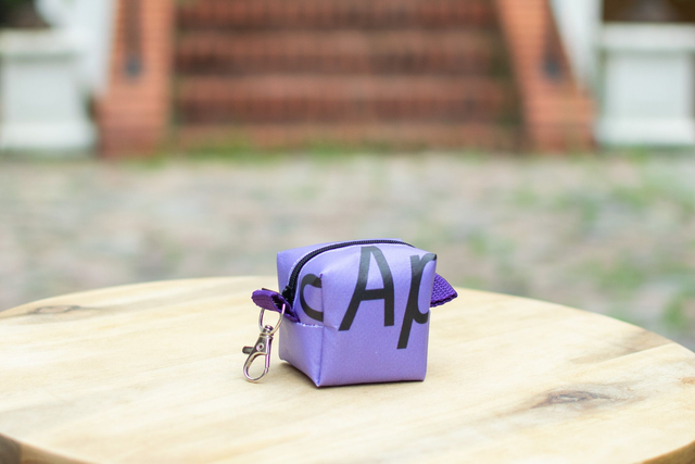 Unique mini-bag made out of upcycled event banners. Sturdy canvas material. Dimensions approx. 6cm x 6cm x 4.5cm with a zipper on top and a belt clip on the side.
