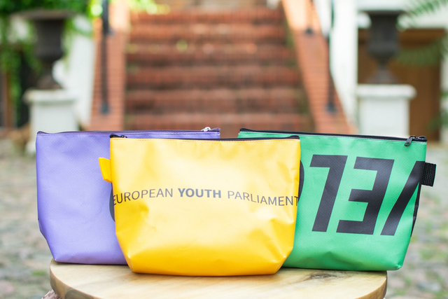 Unique toiletry bag made out of upcycled event banners. Sturdy canvas material. Dimensions approx. 22cm x 15.5cm x 5.5cm with a zipper on top.